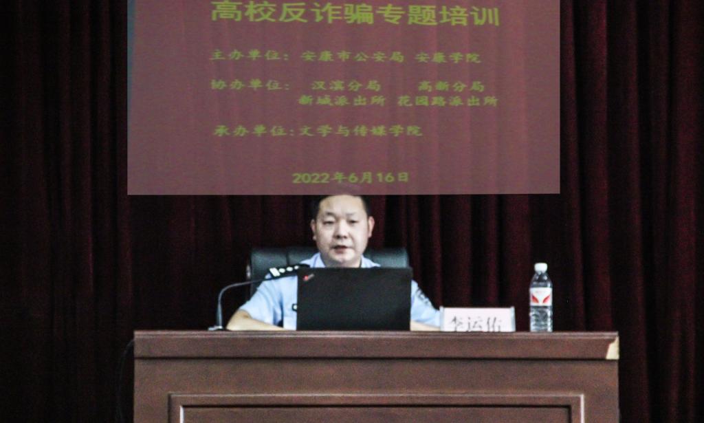 为深入贯彻落实习近平总书记对打击治理电信网络诈骗犯罪工作的指示精神,进一步提升我校师生防范“电信网络诈骗”意识和能力,遏制“电信网络诈骗”案件在我校发生,2022年6月16日下午,pp电子游戏平台网站和安康市公安局携手在江南校区大礼堂开展高校反电信诈骗专题教育培训活动。本次活动采用线上直播和线下集体讲座相结合的形式进行,由校保卫处主办,pp电子游戏平台网站承办。全国刑事信息研判专家、安康市反诈中心主任李运佑、警员康洋,我校所属辖区安康市汉滨区新城派出所、高新区花园路派出所民警,pp电子游戏平台网站保卫处全体成员、学工部、各二级学院师生代表参会。