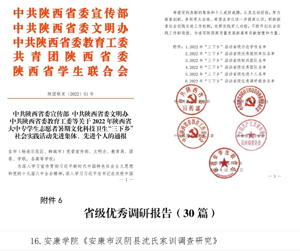 导航痕迹 首页 > 新闻通知 > 学院新闻 > 正文 学院新闻 通知公告 pp电子游戏平台网站“三下乡”社会实践报告获省级优秀调研报告 发布人: 发布日期:2022年10月24日 阅读次数: 近日,中共陕西省委宣传部、中共陕西省委文明办、中共陕西省委教育工委、共青团陕西省委、陕西省学生联合会组织的2022年陕西省大中专学生志愿者暑期文化科技卫生“三下乡”社会实践活动评选结果公布。pp电子游戏平台官网赴汉阴县开展家训文化调查暑期社会实践团队(带队老师:李欣逸;团队成员:王彧潇、康贤洁、王英培、欧童谣、刘静)所撰写的实践报告《安康市汉阴县沈氏家训调查研究》获评“省级优秀调研报告”。 pp电子游戏平台网站近年来积极组织“三下乡”暑期社会实践活动,将专业特色与社会实践进行有机结合,从而推动文化创新发展,不断增强学生的文化自信和文化认同感,助力社会实践活动高质量发展。 撰稿、图片/王彧潇 审核/杨海蓉 发布/薛涛