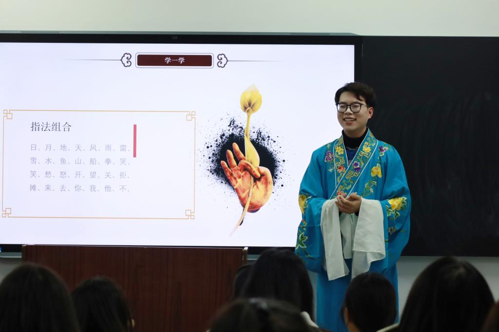 在角色介绍部分,梁少华运用浅显易懂、风趣幽默的语言,向学生介绍了秦腔的行当划分,介绍丑角行当时,他的一段段示范,惹得学生欢笑连连。互动体验环节,梁少华拿出来他的戏服让同学试穿体验,戏服上的精美纹样,引得同学们连连赞叹。随后,梁少华向同学们介绍秦腔的指法组合,并向学生展示,学生们也举起双手跃跃欲试。