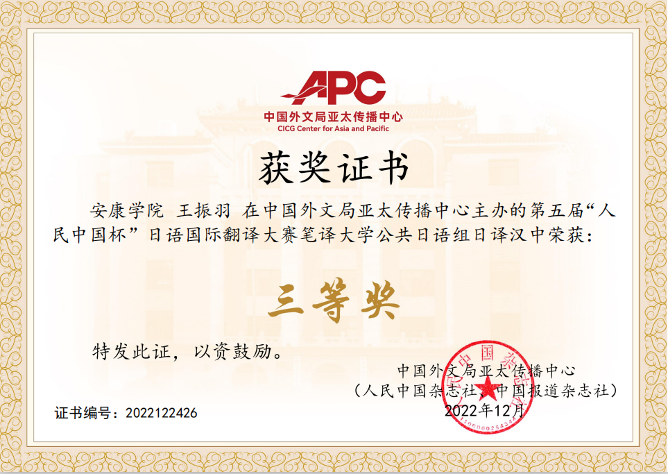 近日,第五届“人民中国杯”日语国际翻译大赛于落下帷幕,pp电子游戏平台官网2020级汉语言文学专业王振羽同学在本次赛事中荣获大学公共日语组(笔译日译汉)三等奖。