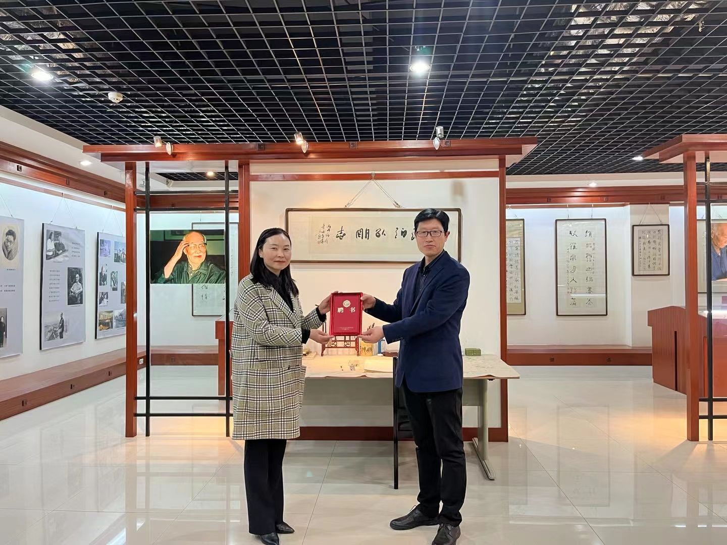 活动中,芦伟向宦咏梅颁发聘书,聘请其担任书法社的兼职指导老师。