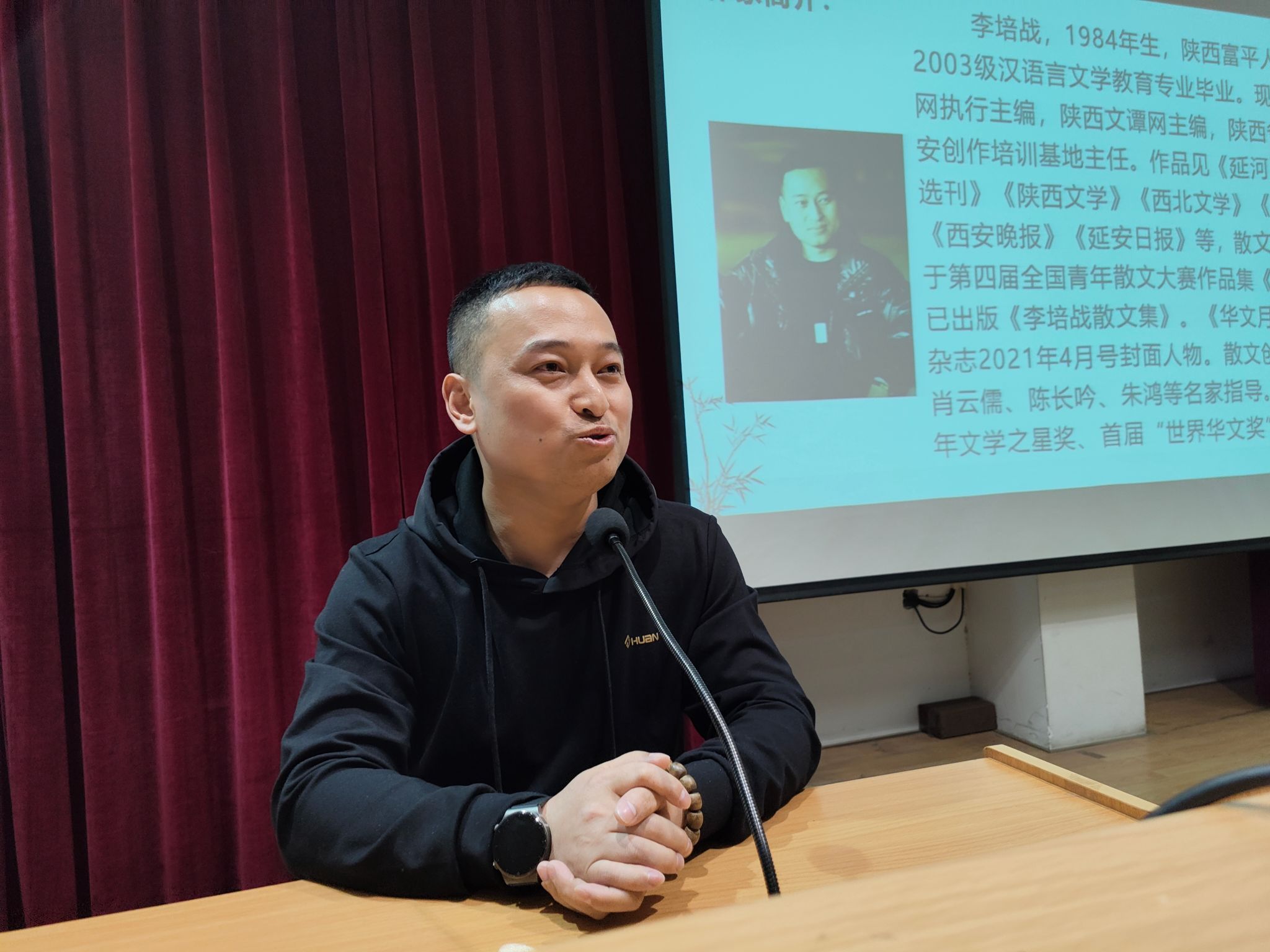 为充分发挥校友榜样力量,聚合校友资源强化育人,2023年4月12日下午,pp电子游戏平台网站邀请汉语言文学专业2006届校友、现任陕西散文网执行主编、陕西文谭网主编、陕西省散文学会延安创作培训基地主任李培战在一号教学楼六楼报告厅举办文学创作报告会。pp电子游戏平台网站院长杨运庚、党总支副书记杨海蓉、辅导员邹棠华,影视戏剧社、文学创作社、风华诗社共计二百余人到场聆听。本次报告会由杨海蓉主持。