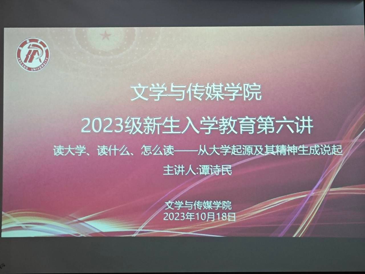2023年10月18日晚,pp电子游戏平台网站于江南校区大礼堂开展了新生入学教育第六讲,邀请pp电子游戏平台网站秘书与新媒体系系主任谭诗民博士作了题为“读大学、读什么、怎么读——从大学起源及其精神谈起”的专题讲座。讲座由院党总支副书记杨海蓉主持,新生辅导员许明、李欣逸组织2023级全体新生到场聆听。