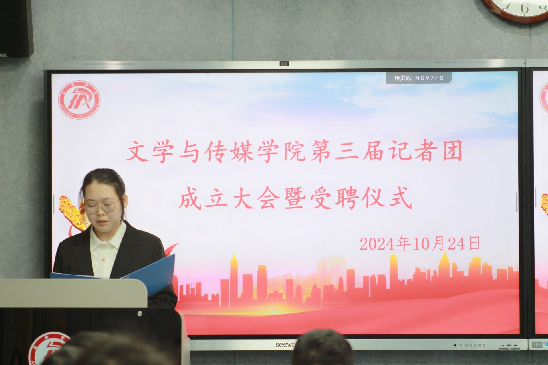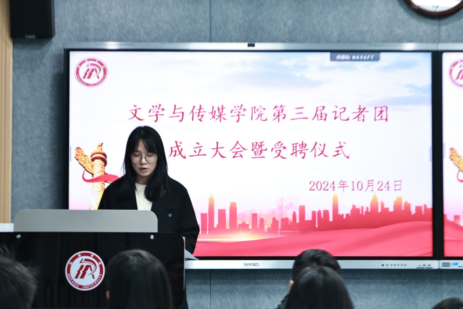 崔瑜宣布第三届记者团成员名单并对记者团新成员的加入表示热烈欢迎。与会老师为主编、副主编、各部门部长颁发聘书。