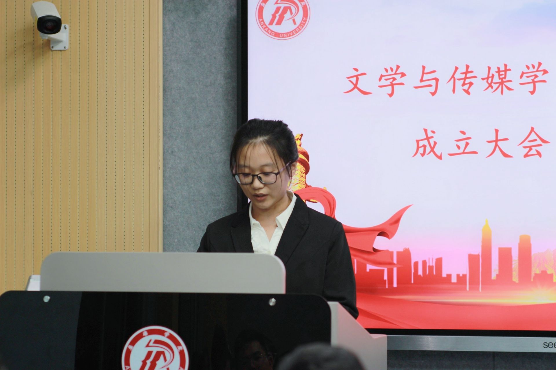 新一届主编肖瑶、副主编王一纯做就职演讲。她们表示,记者团将在新媒体人才专业能力提升上加大培训力度,注重团队成员综合素质的发展,继续围绕学院中心工作开展活动,客观、公正、及时地宣传报道学院要闻,共同为学院新闻宣传贡献力量。