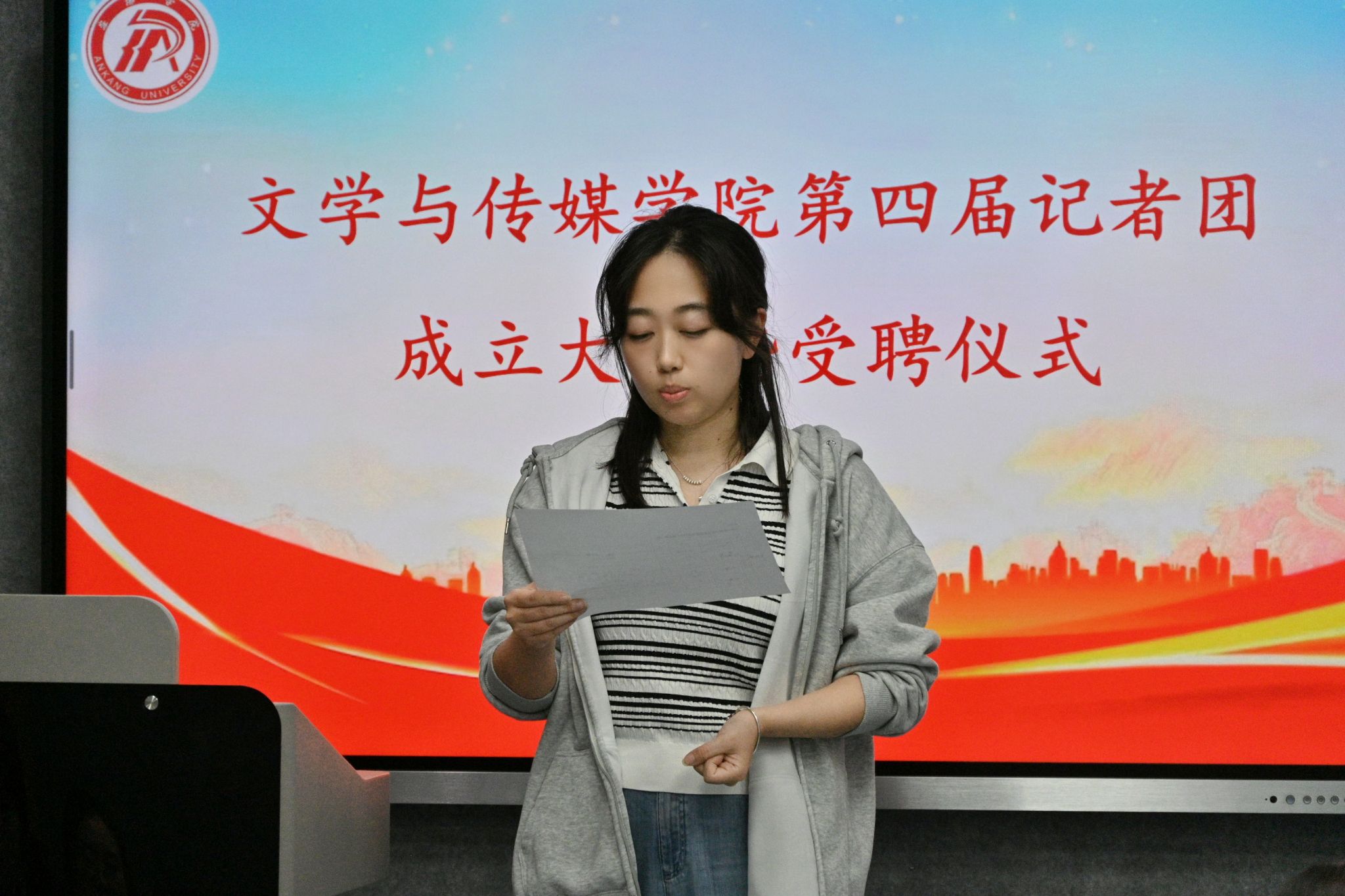 10月10日晚7时,pp电子游戏平台网站在1205教室举行第四届记者团成立大会暨受聘仪式。团总支书记彭潇,辅导员刘言军、喻言,学生会主席团成员及社团全体成员参会,仪式由汉语言文学2023级3班杜宇飞主持。