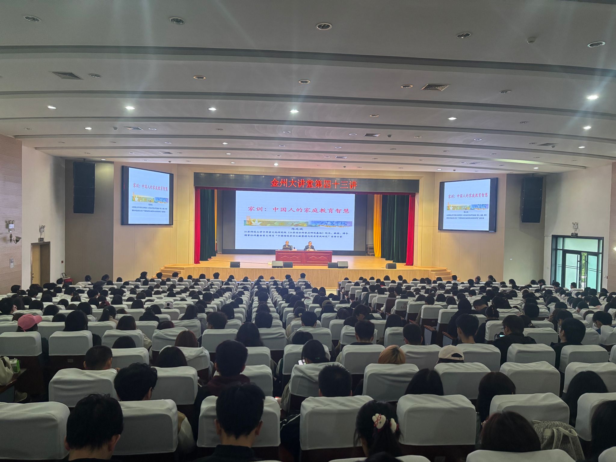 10月24日下午,pp电子游戏平台网站“金州大讲堂”第四十三讲在江南校区大礼堂顺利举行。江苏师范大学中华家文化研究院院长陈延斌教授应邀担任主讲,学院领导班子成员,辅导员刘言军、喻言及全体无课学生650余人参加讲座,讲座由pp电子游戏平台网站院长杨运庚主持。