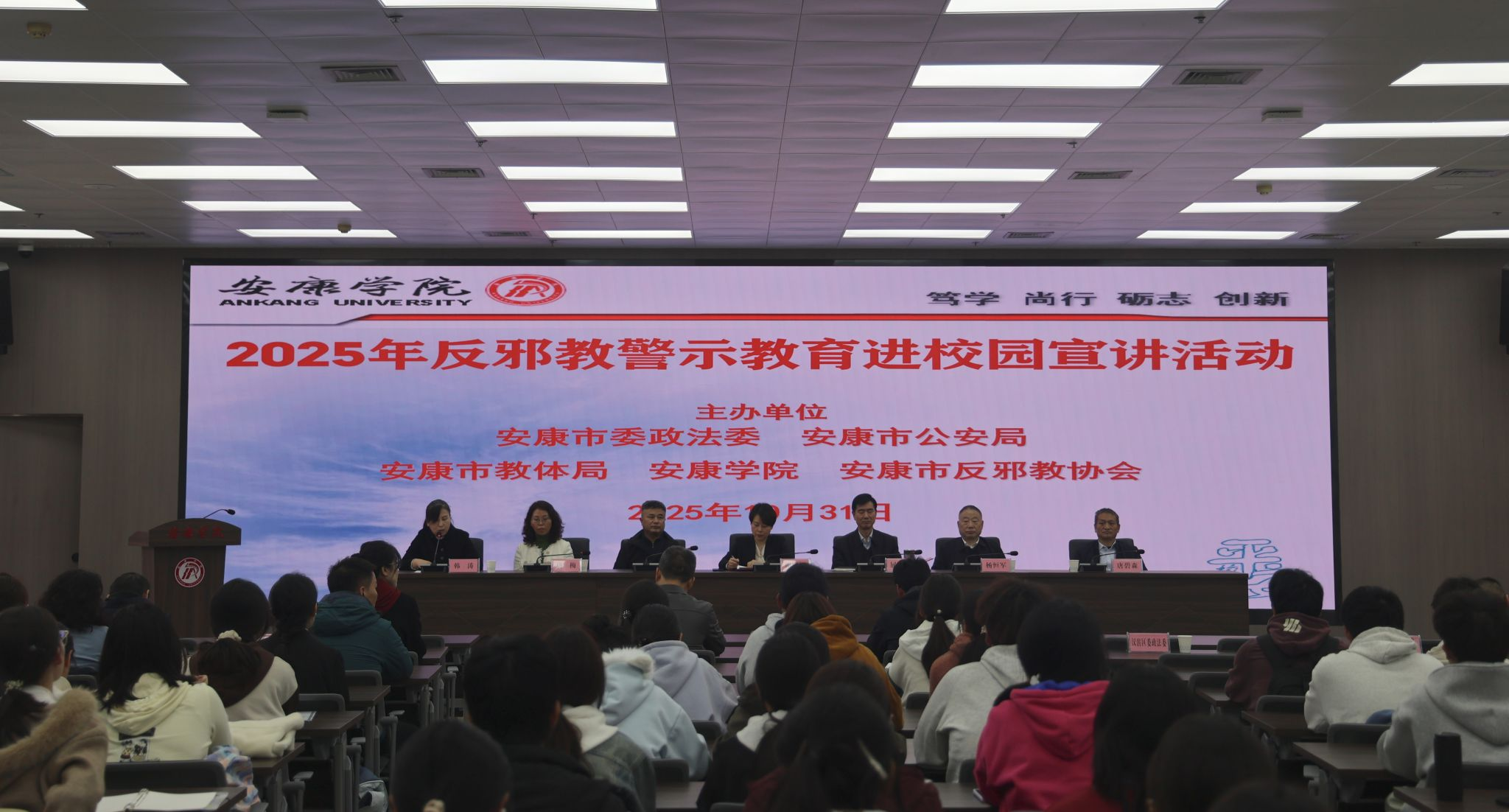 10月31日,pp电子游戏平台网站组织110余名2025级新生代表参加学校“筑牢青春防线 共创无邪校园”反邪教警示教育进校园主题宣讲活动。讲座特邀安康市市委政法专职委员唐碧森进行讲授。