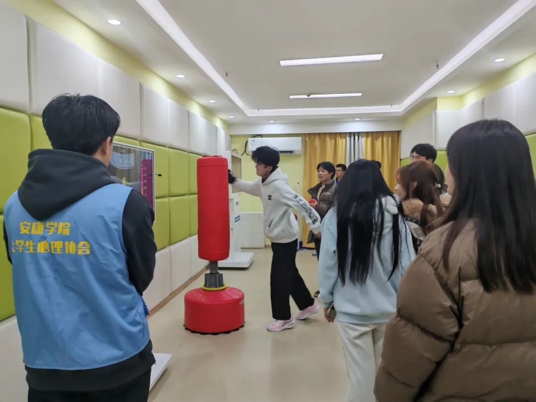 在讲解员引导下,同学们了解了学校心理健康教育中心的体系架构、日常心理咨询服务的运行机制以及服务内容,并参观个体咨询室、团体咨询室、沙盘治疗室、音乐放松室、情绪宣泄室等多个功能室。通过亲身体验击打宣泄仪器、骑行放松设备、沉浸式心理体验系统以及沙盘教具等设施,深入了解各类设备的使用方法与心理调节原理。在情绪宣泄室,不少同学在安全引导下体验了宣泄设备,直观感受到压力释放的有效途径;在沙盘活动区,大家通过摆放沙具开展自我表达,逐步理解潜意识情绪的外化过程。这种“体验—感知—理解”的参观模式,让抽象的心理知识变得具体可感。