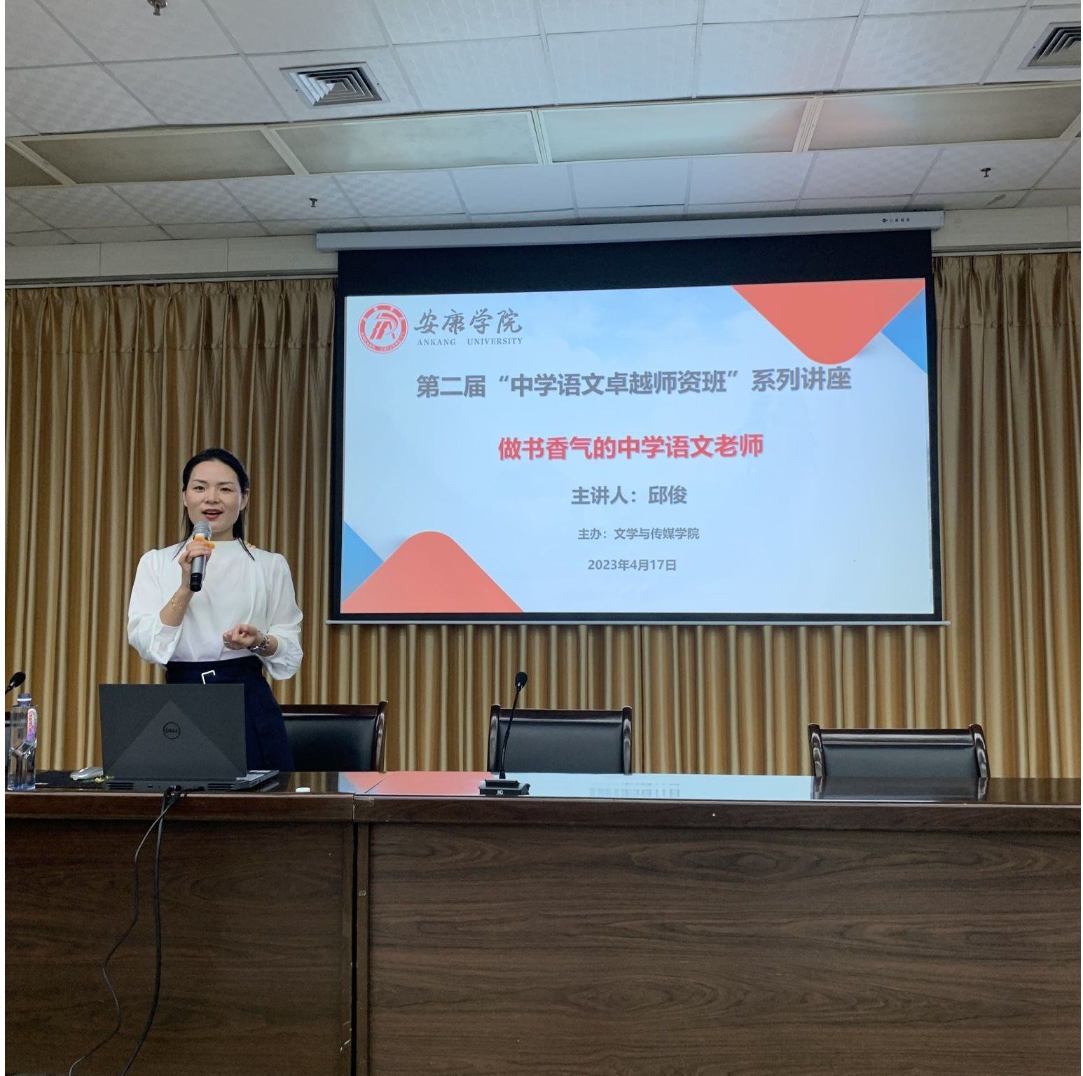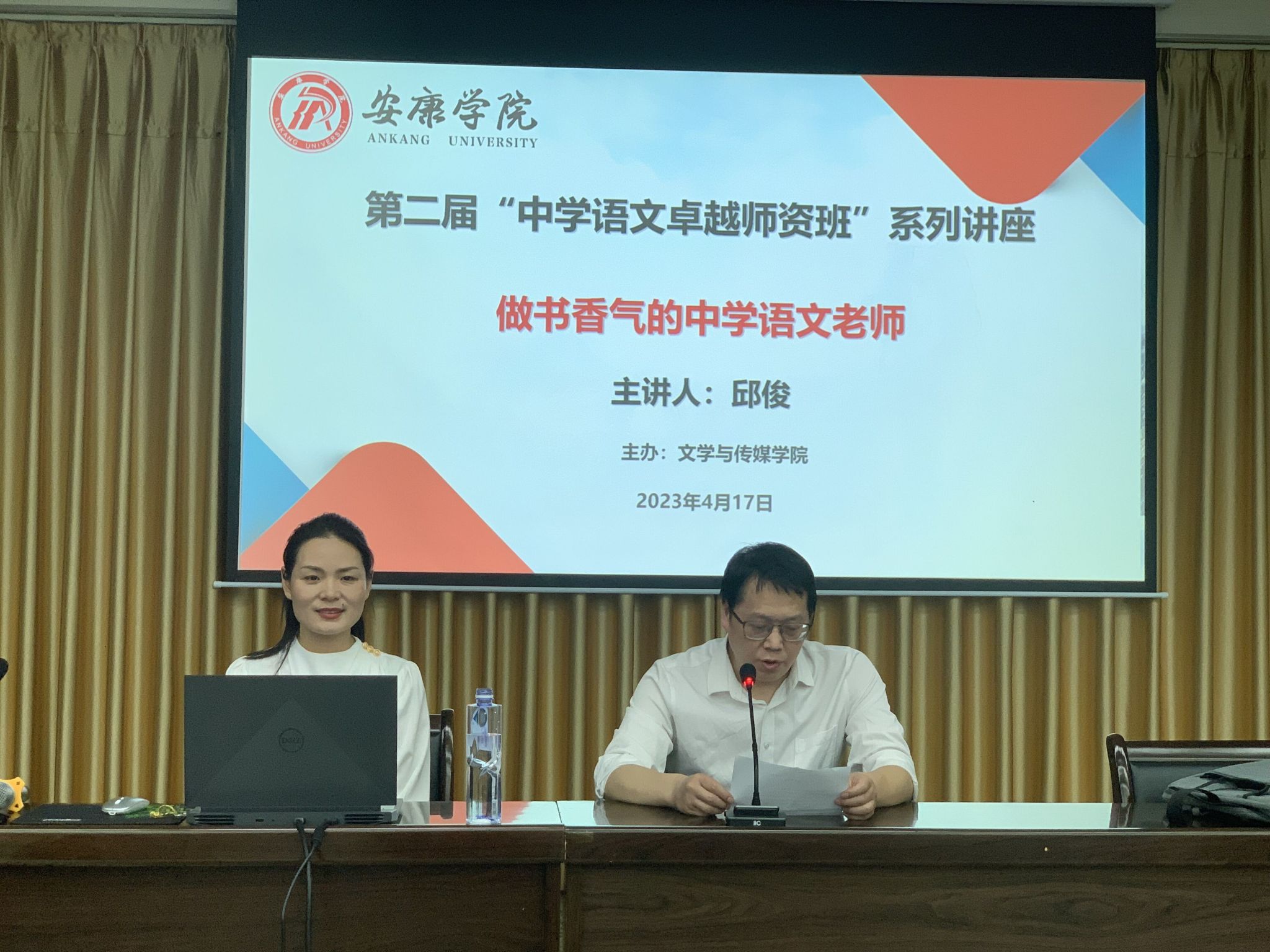 2023年4月17日下午七点半,陕西省教学名师、安康市教研室专家邱俊老师应邀为pp电子游戏平台官网第二届“中学语文卓越师资班”系列讲座做了题为“做书香气的中学语文老师”的首场讲座。讲座由pp电子游戏平台网站副院长朱云主持,班主任张格瑄和“中学语文卓越师资班”的135名同学聆听了本场讲座。