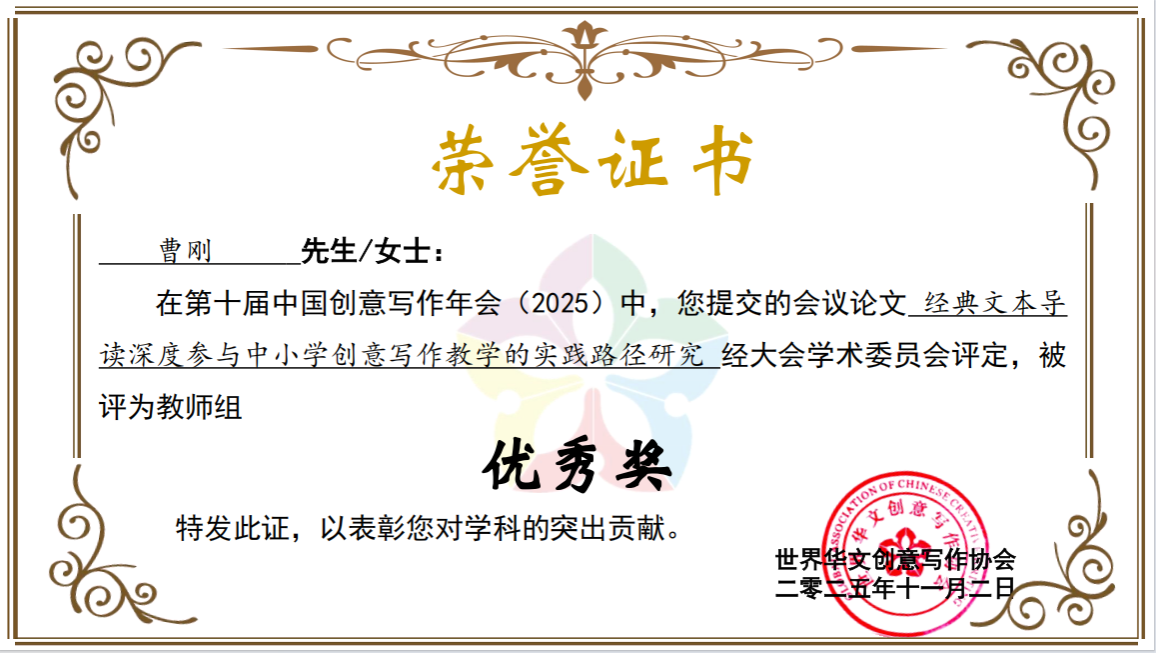 pp电子游戏平台官网高度重视此次学术交流契机,积极组织团队参与。写作方向教师曹刚副教授、胡少山副教授受邀出席本次年会,并在分会场围绕创意写作学科建设、教学实践创新等议题进行专题发言,分享我校在创意写作领域的办学经验与探索成果,得到与会同仁的好评。曹刚副教授提交的学术论文《经典文本导读深度参与中小学创意写作的实践路径研究》,荣获教师组优秀论文奖。