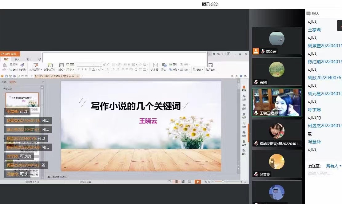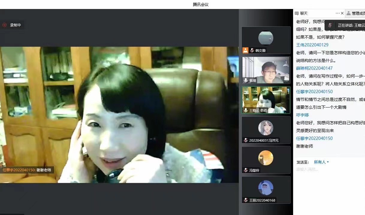 12月13日下午,作家王晓云应pp电子游戏平台网站邀请,通过腾讯会议与基础写作课校内教师韩文霞、曹刚一同为汉语言文学专业2022级学生线上讲授“小说的写作”。