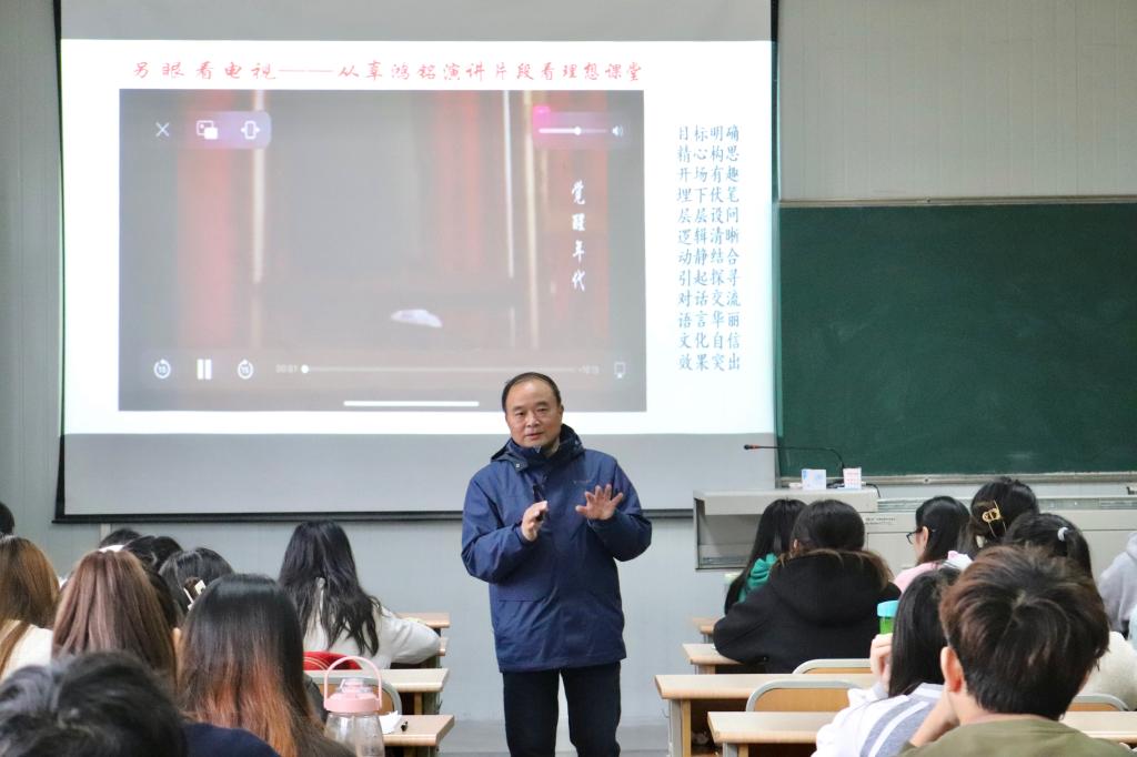 讲座电视剧《觉醒年代》中辜鸿铭的演讲片段引入,启发学生思考如何构筑理想课堂与追寻有效教学,使学生认识到“理想课堂”需要目标明确、精心构思、埋下伏笔对话交流等要素。随后,李玉恒重点围绕文本解读的内涵、切口、策略不同类型文本解读实操技巧等方面展开内容讲述。生动的案例、富于启发的引导使学生在聆听和互动中明白了语文阅读教学的重要性以及如何正确深入地解读文本的具体方法