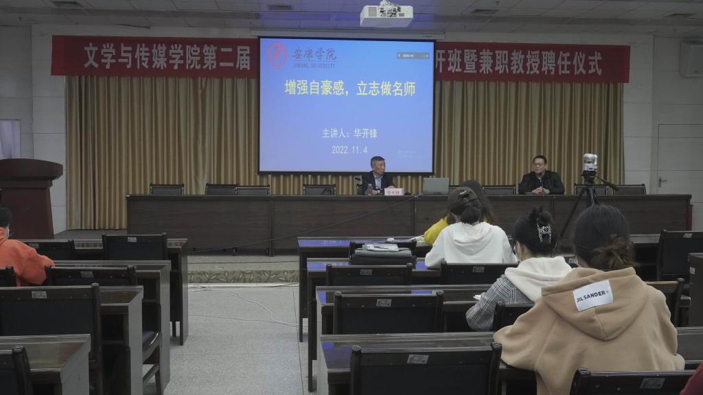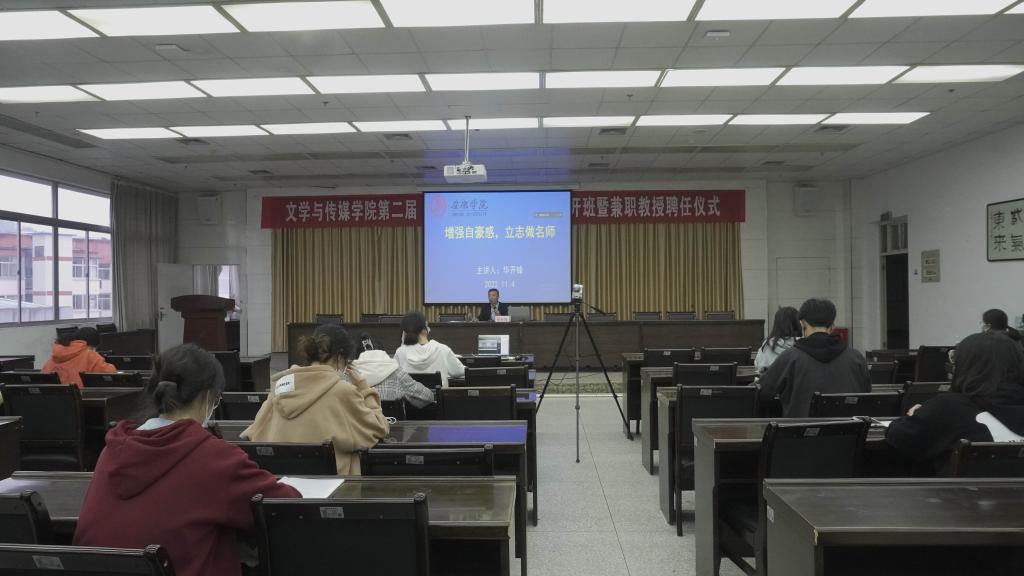2022年11月4日下午三点半,优秀校友、陕西省首批基础教育名师、特级教师华开锋应邀为pp电子游戏平台官网第二届“中学语文卓越师资班”做了题为“增强自豪感,立志做名师”的首场学术报告。pp电子游戏平台网站副院长朱云、卓越师资班班主任张格瑄和三个会场132名同学共同聆听了本场讲座。