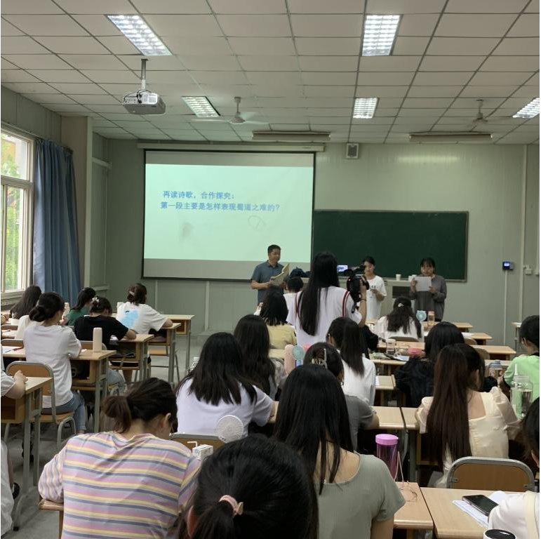 活动伊始,张铁军老师以《蜀道难》一课为例,声情并茂地向同学们讲授了蜀道的“山高、路险、人恶”之难,从导入到诵读、到剖析,层层深入,一咏三叹,全方位展示了一个优秀语文教师扎实的专业素养。随后,张老师以《记梁任公先生的一次演讲》一文为线索,生动地向大家阐明一堂好课的关注点必须是教者、学者、旁观者的融合,一堂好课的三个评价维度应包含掌声、笑声和讨论声。
