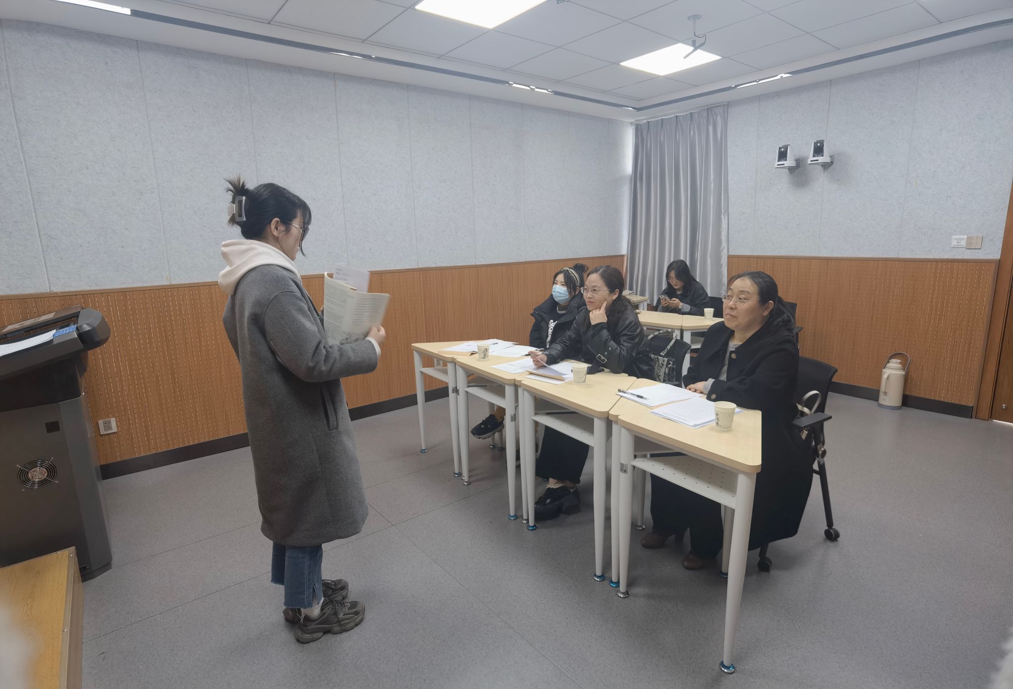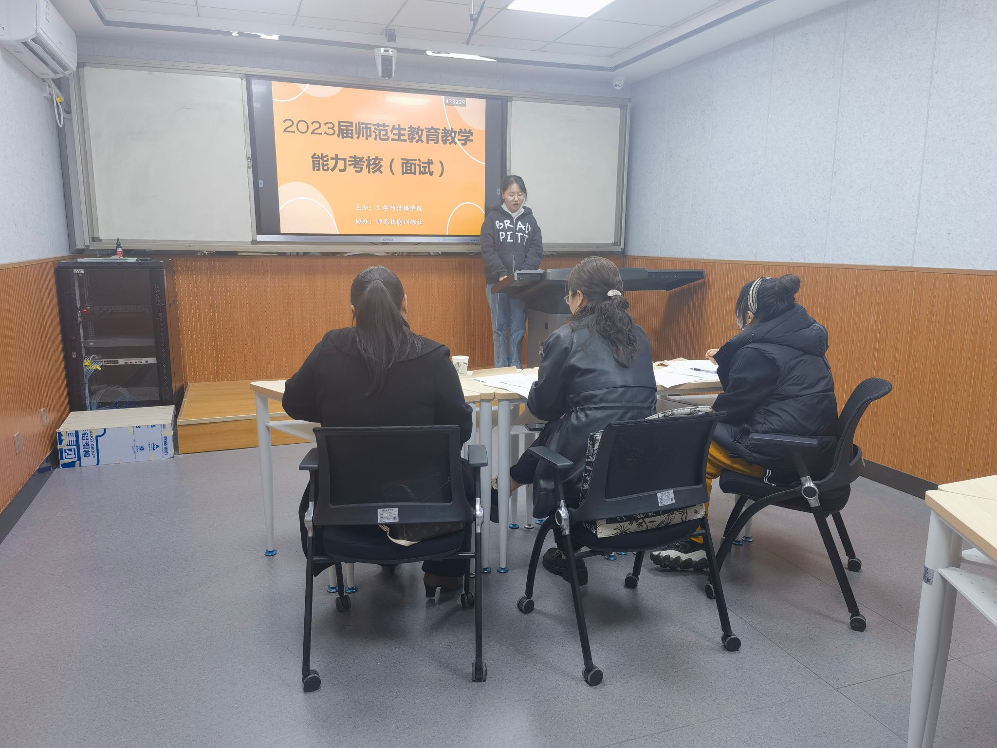 3月18日上午,汉语言文学系主任韩文霞组织师范技能社指导教师及学生召开组织、服务工作说明会,做好了人员安排并布置考试现场。下午14:00,第一位考生开始试讲,其他考生在候考室、抽题室做好考核准备。考试按照国家关于师范生教育教学能力考核面试工作的程序要求进行,每位考生30分钟备课、10分钟讲课、5分钟说课、5分钟现场答辩。考官根据考生的职业认知、仪表仪态、言语表达、思维品质、教学设计及实施等进行综合评分,评分保证合规、公平。