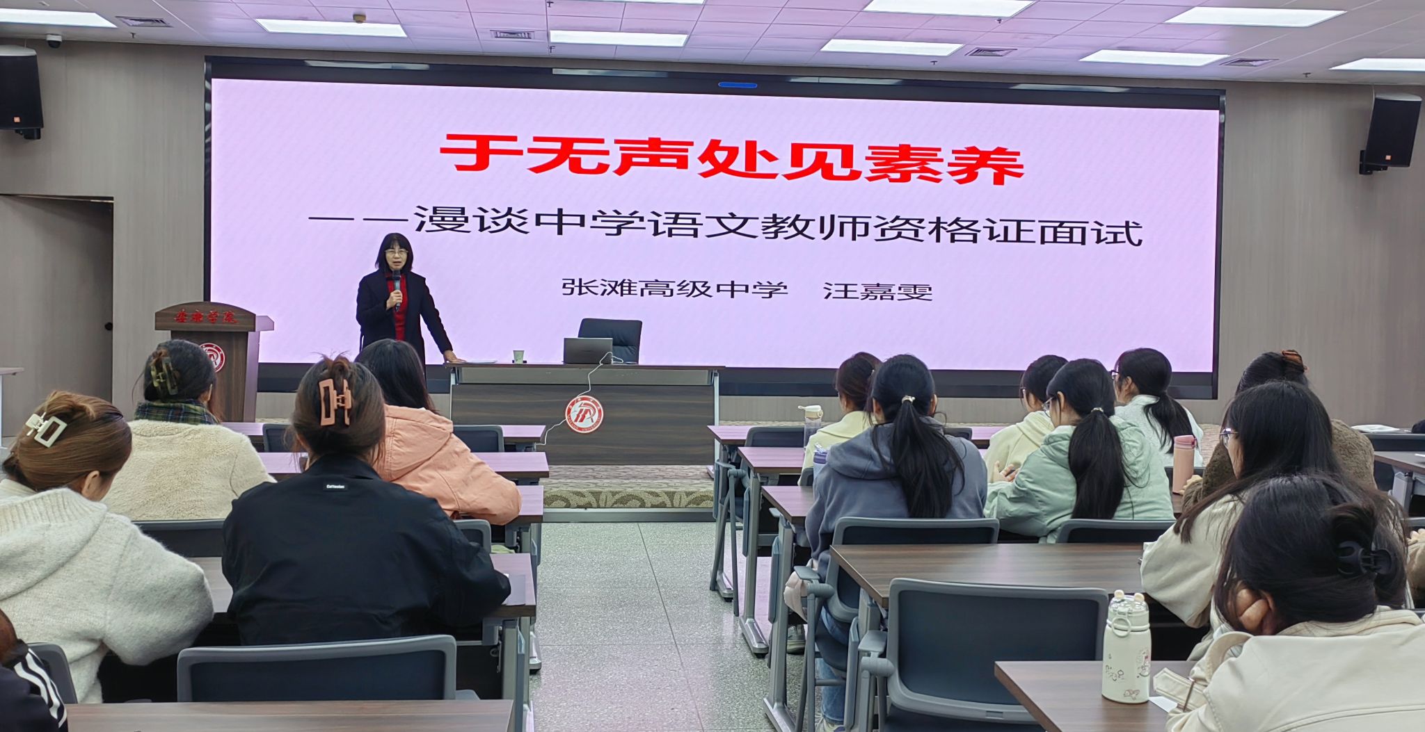 助力学生顺利通过教师资格证面试,掌握备考策略,2024年11月20日,在图书馆六楼报告厅,pp电子游戏平台网站邀请到张滩高级中学正高级教学名师汪嘉雯老师为第“中学语文卓越师资班”带来题为“于无声处见素养——漫谈中学语文教师资格证面试”的专题讲座活动,班主任唐明珍和师资班全体学生聆听了本场讲座。